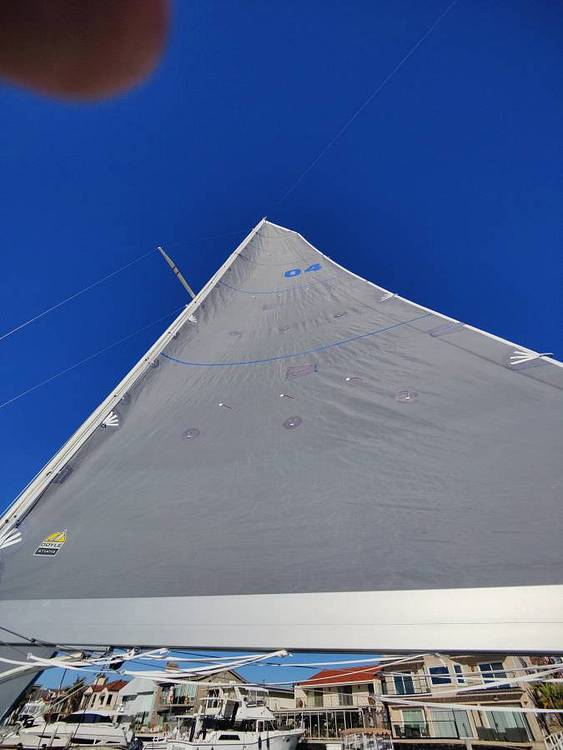 This boat has been thoughtfully upgraded for a single‑handed Transpac, and makes for a great short-handed day sailer as well. She carries a newer Doyle Stratis Main cut for a longer boom with high roach and full battens, a newer Doyle Stratis self‑tacking jib, and a newer Doyle Code Zero for powerful reaching.